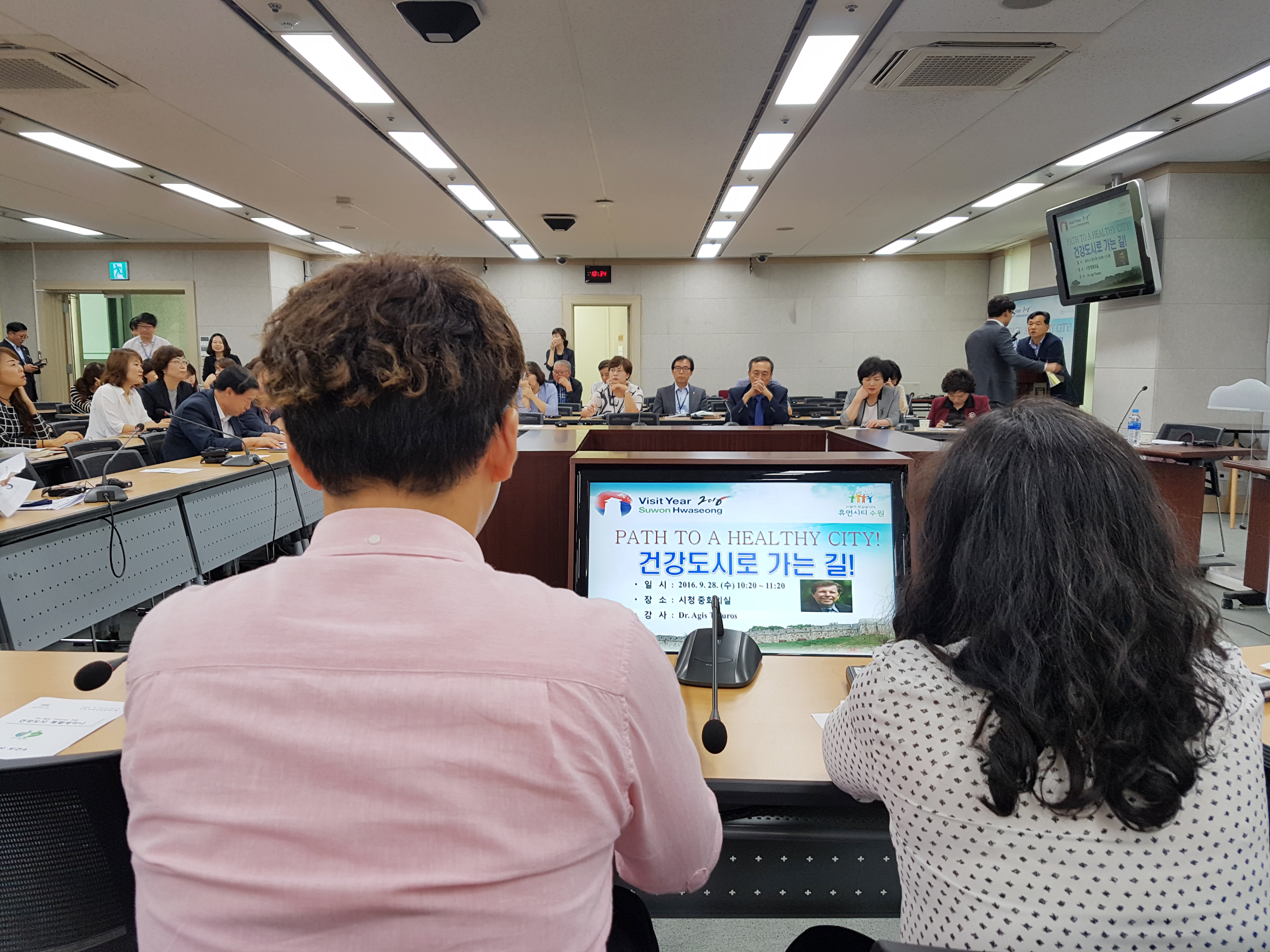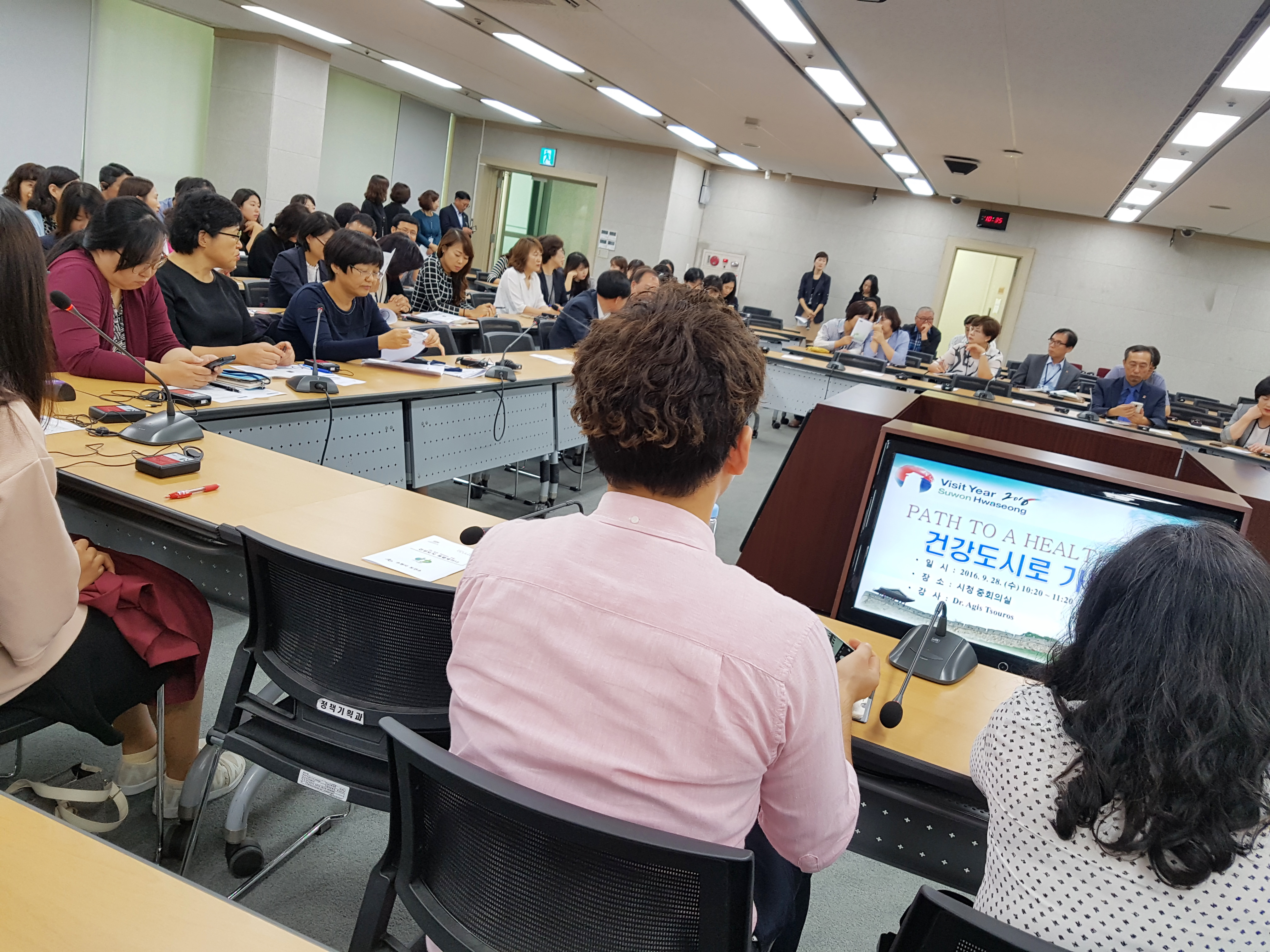 오늘은 수원시청 중회의실에서 '건강도시로 가는 길!'을 주제로 특별 세미나가 개최되었어요.