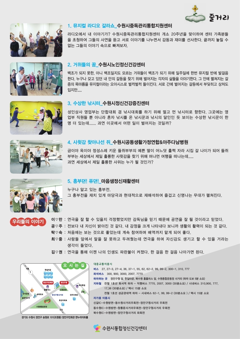 수원시정신건강증진센터의 배우님들께서는 여유넘치는 연기와 팀워크를 보여주세요.