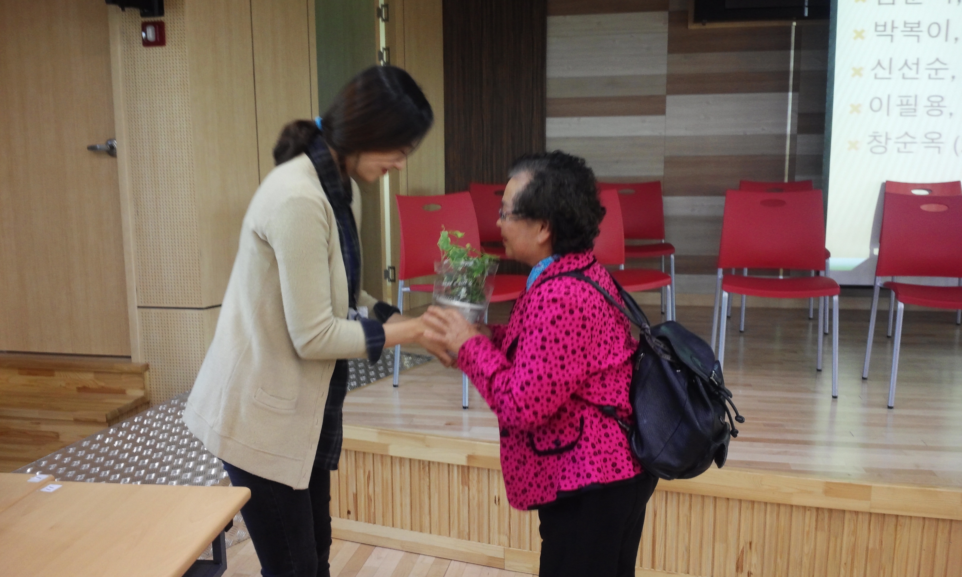 2부 순서로 6회를 모두 참석하신 어르신들에게 개근상을 수여하고 재가회원교육 수료식을 진행하였습니다. 개근한 어르신 20여 명에게 기념 화분을 전달하였고 기념 떡을 참여하신 모든 어르신들에게 드리니 교육을 시켜준 것도 고마운데 선물까지 주니 너무 고맙다며 내년에도 열심히 교육에 참여하고 활동을 열심히 하여 우울증을 극복해 보겠다는 의지를 보여 주셨습니다.