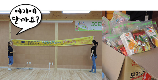 이렇게 현수막도 달고~ 워크숍에 참석한 선생님들을 위한 간식들과 티셔츠 등등을 준비했습니다! 정성스럽게 포장된 간식 보이시죠?![]()