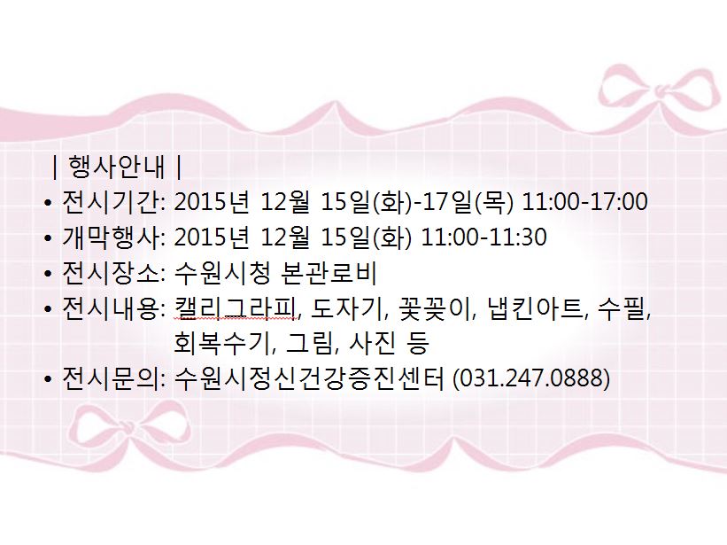 수원시청1층 로비에서 센터 회원 및 가족, 직원들의 다양한 작품들을 전시하는 전시회를 진행합니다.