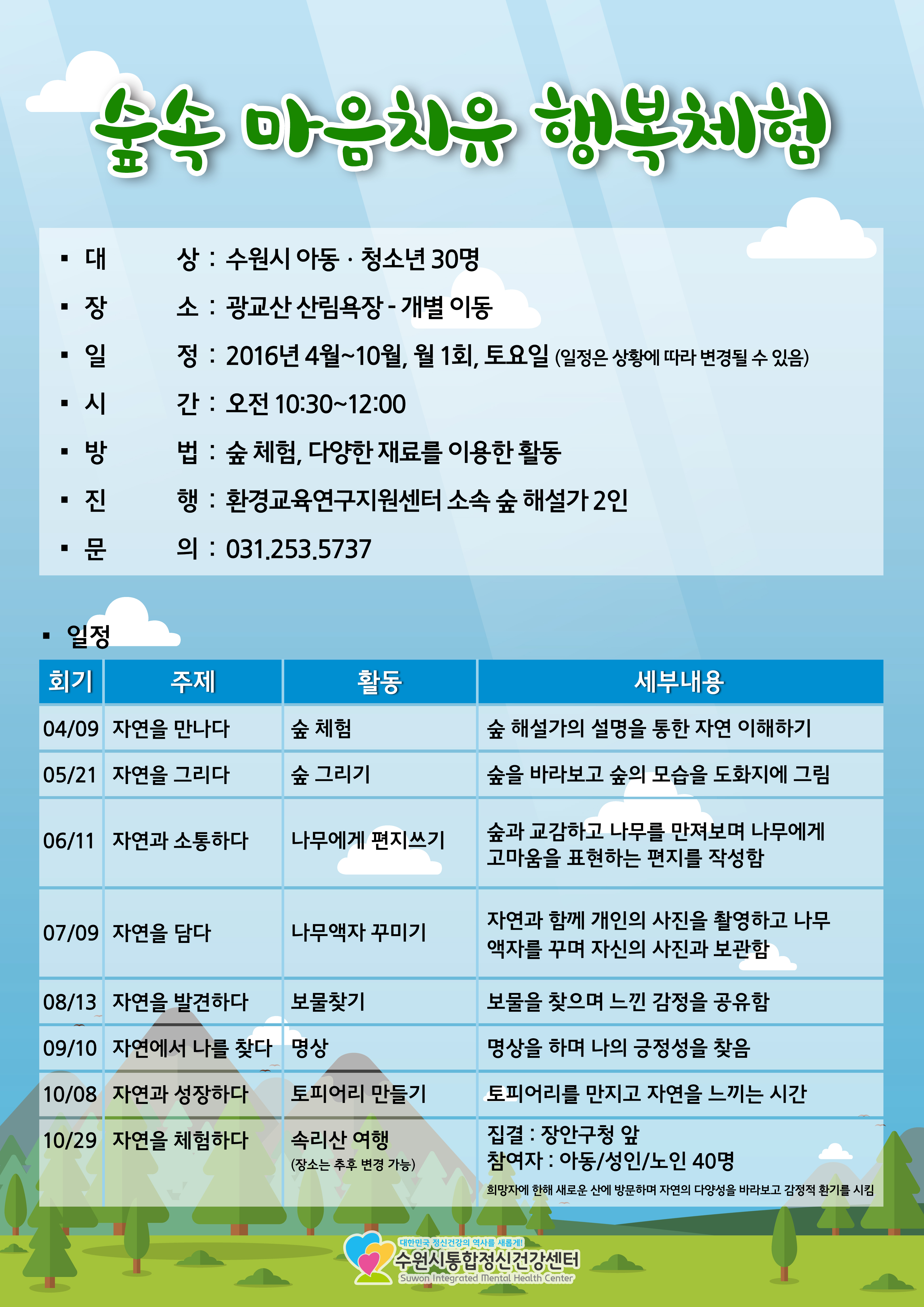 수원시통합정신건강센터에서는 숲에서의 활동을 통해 스트레스를 감소시키고 심신의 안정을 도모하여 개개인의 회복탄력성을 증진시킬 수 있는 '숲속 마음치유 행복체험' 참가자를 모집하고 있습니다^^ 궁금하신 점이나 신청 문의는 031-253-5737로 해주세요!