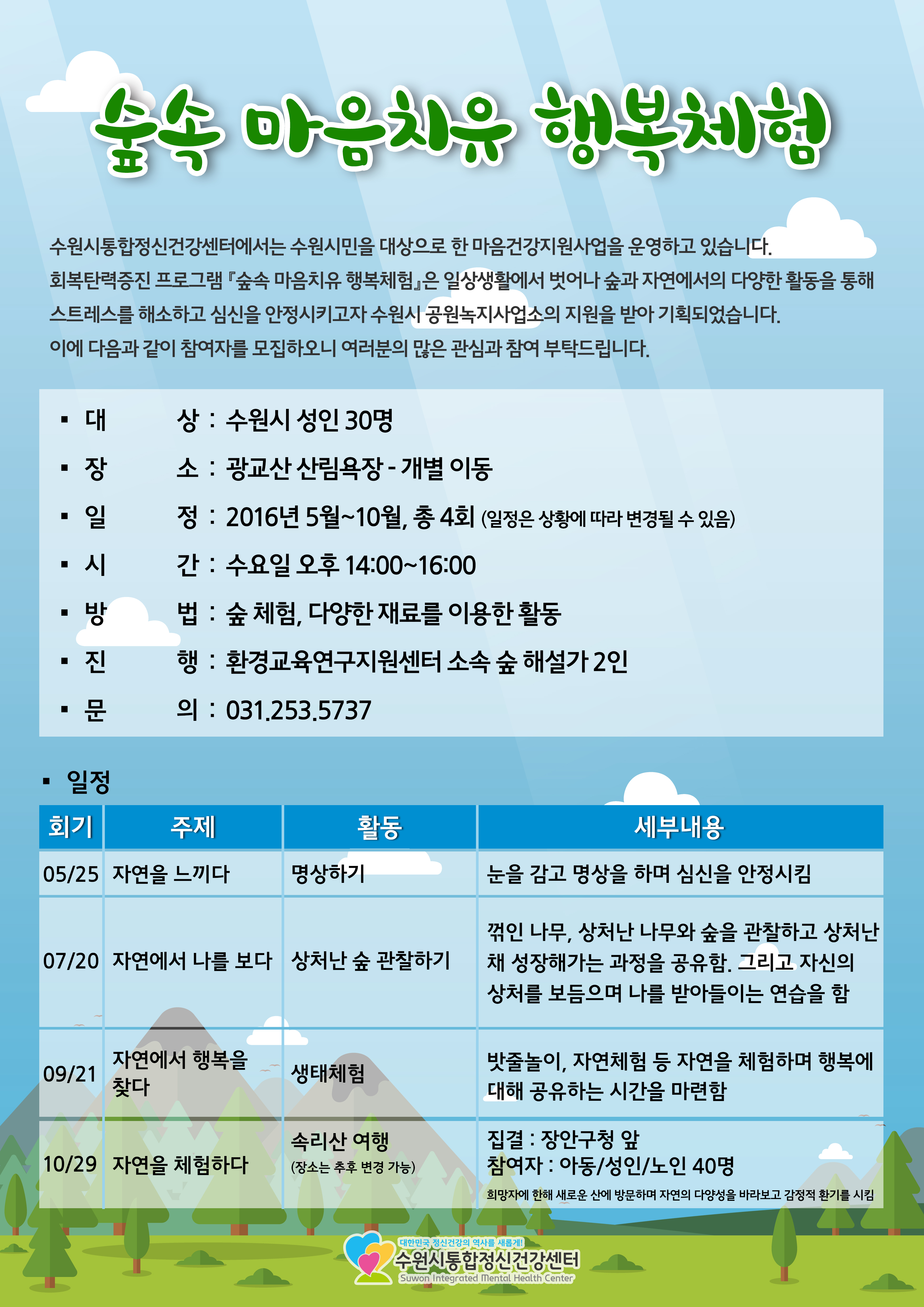 수원시통합정신건강센터에서는 숲에서의 활동을 통해 스트레스를 감소시키고 심신의 안정을 도모하여 개개인의 회복탄력성을 증진시킬 수 있는 '숲속 마음치유 행복체험' 참가자를 모집하고 있습니다^^ 궁금하신 점이나 신청 문의는 031-253-5737로 해주세요!