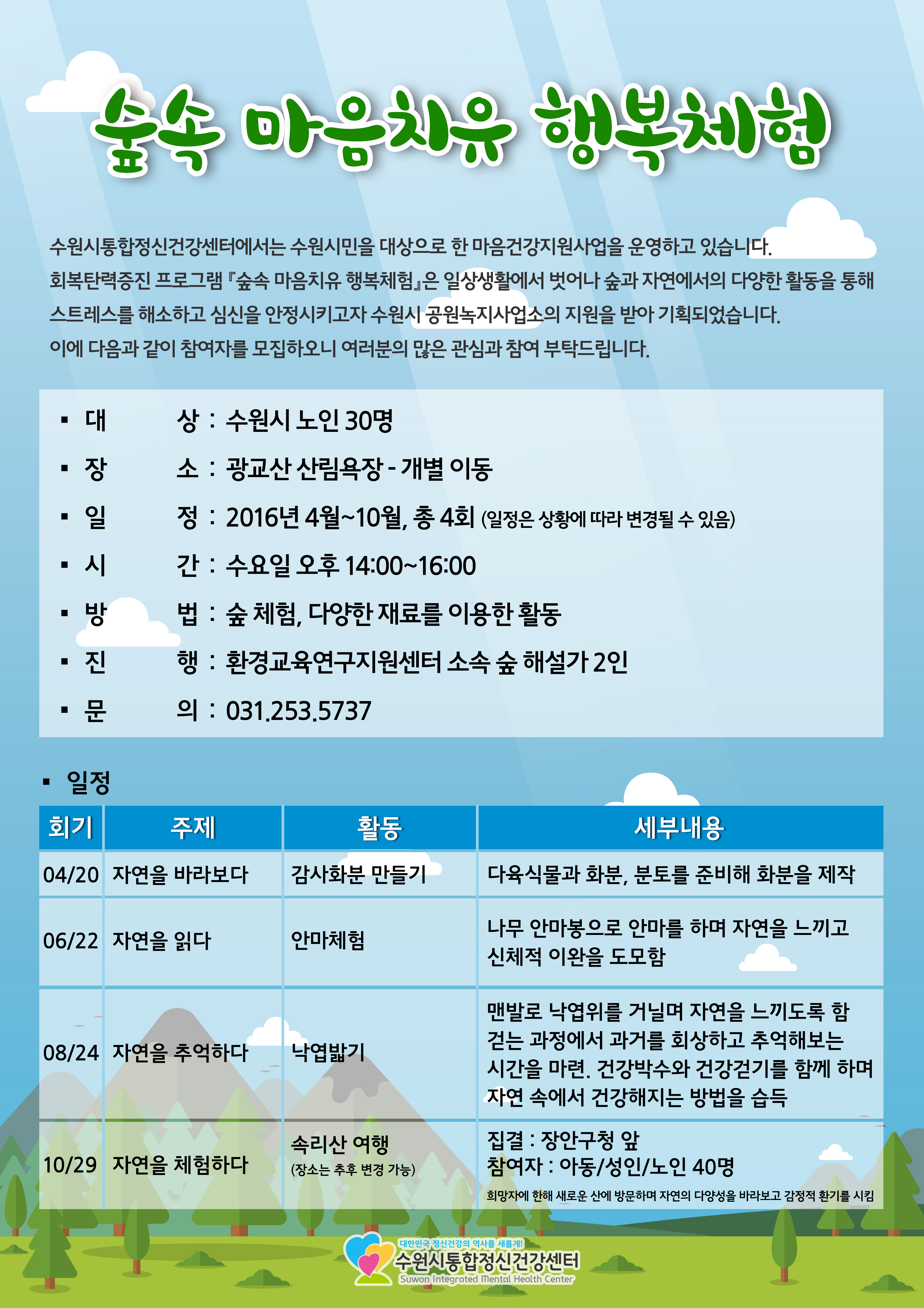 수원시통합정신건강센터에서는 숲에서의 활동을 통해 스트레스를 감소시키고 심신의 안정을 도모하여 개개인의 회복탄력성을 증진시킬 수 있는 '숲속 마음치유 행복체험' 참가자를 모집하고 있습니다^^ 궁금하신 점이나 신청 문의는 031-253-5737로 해주세요!
