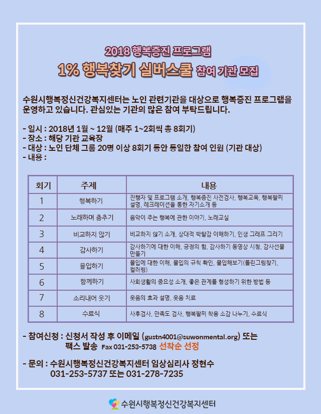 | 행복증진 프로그램 '1% 행복찾기 실버스쿨' 참여 기관 모집 | |||