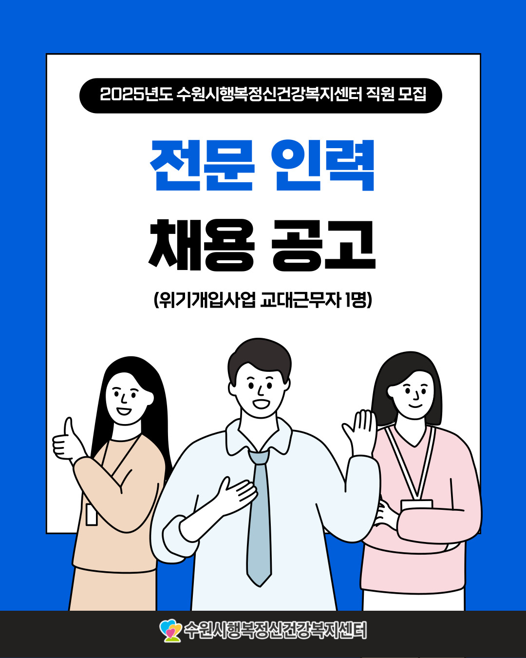 | 2026년도 수원시행복정신건강복지센터 직원 모집(위기개입사업 교대근무자 1명) | |||