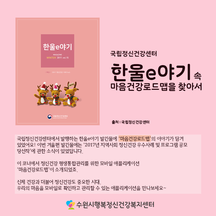 이번 발간물에서는 2017년 지역사회 정신건강 우수사례 및 프로그램 공모 당선작에 관한 코너가 있었는데요, 바로 그곳에 마음건강로드맵이 소개되었어요! 지난해 보건복지부 수상한 마음건강로드맵의 소식을 전해드렸었죠?!