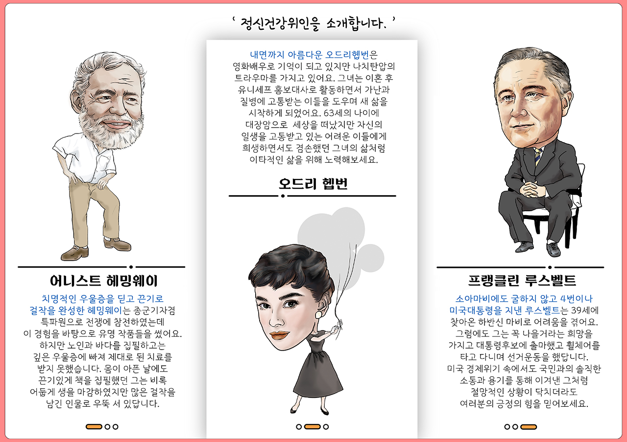 | 정신건강위인을 소개합니다 - 헤밍웨이 / 헵번 / 루스벨트 | |||