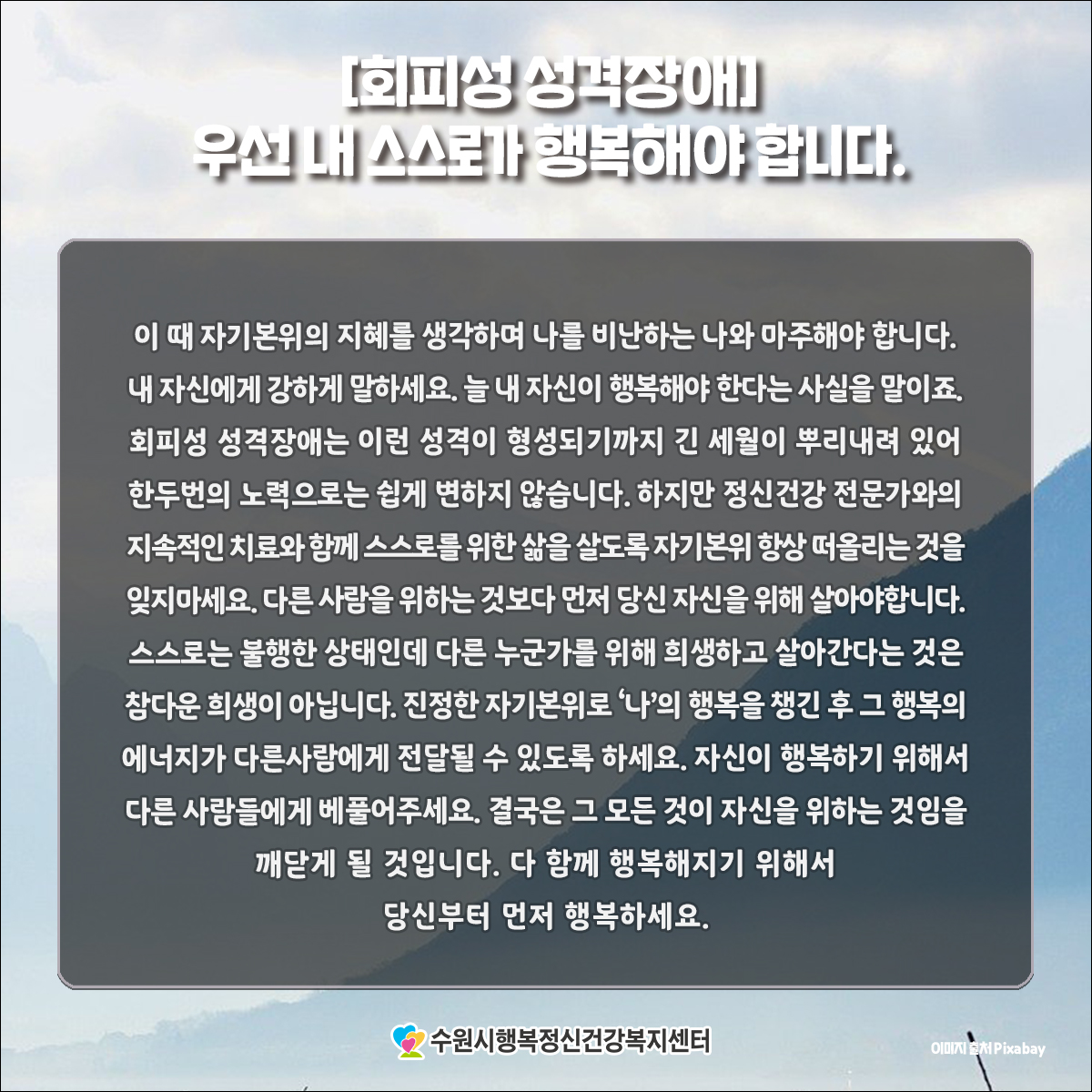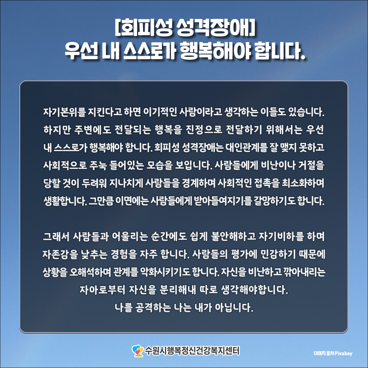 | [회피성 성격장애] 우선 내 스스로가 행복해야 합니다. | |||