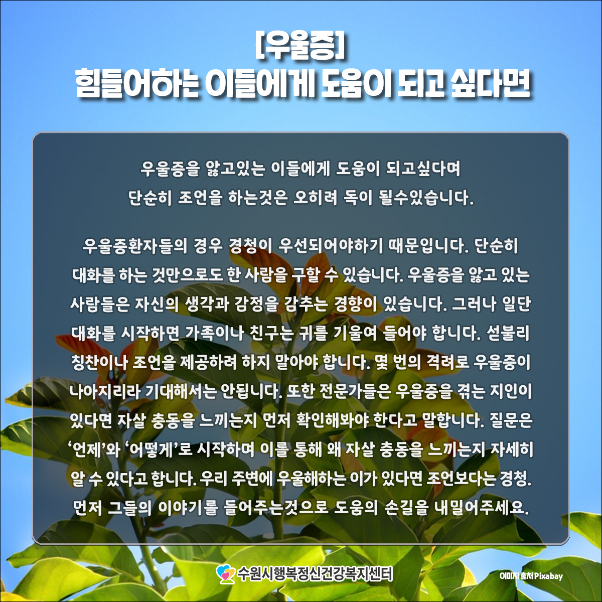 | [우울증] 힘들어하는 이들에게 도움이 되고 싶다면 | |||