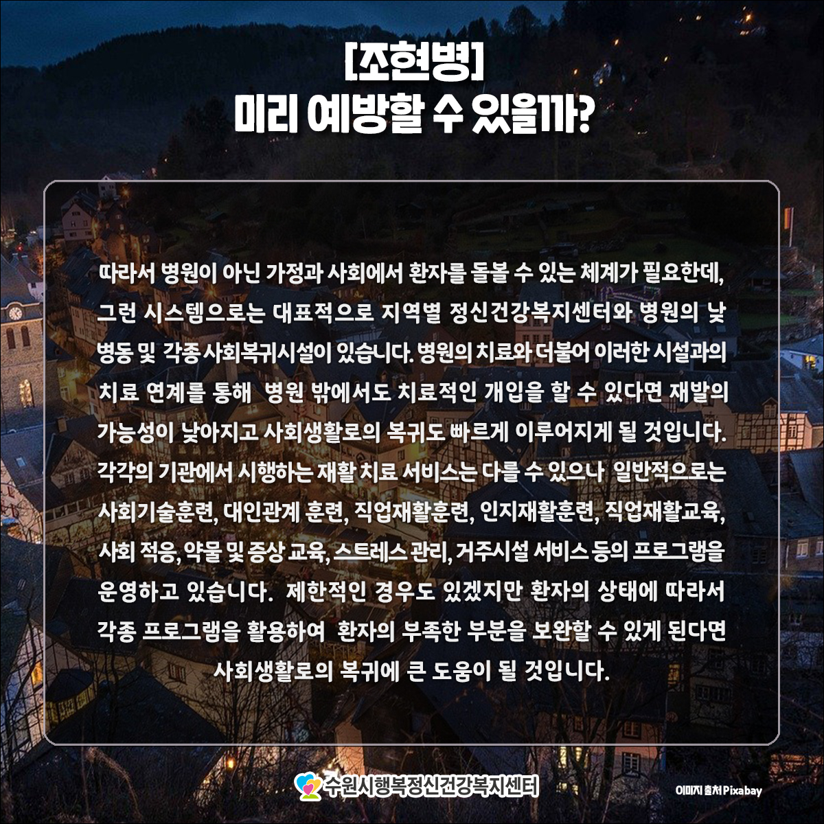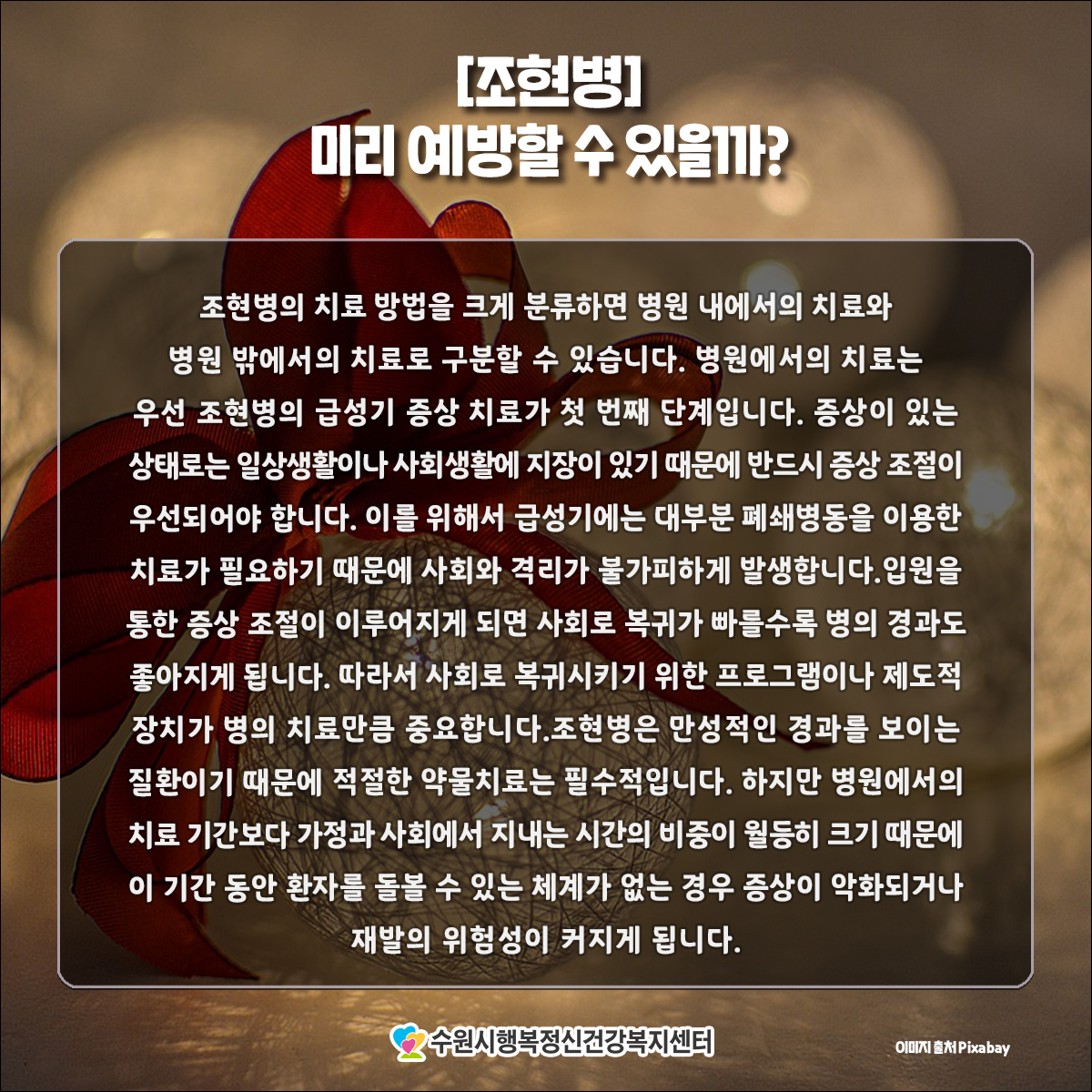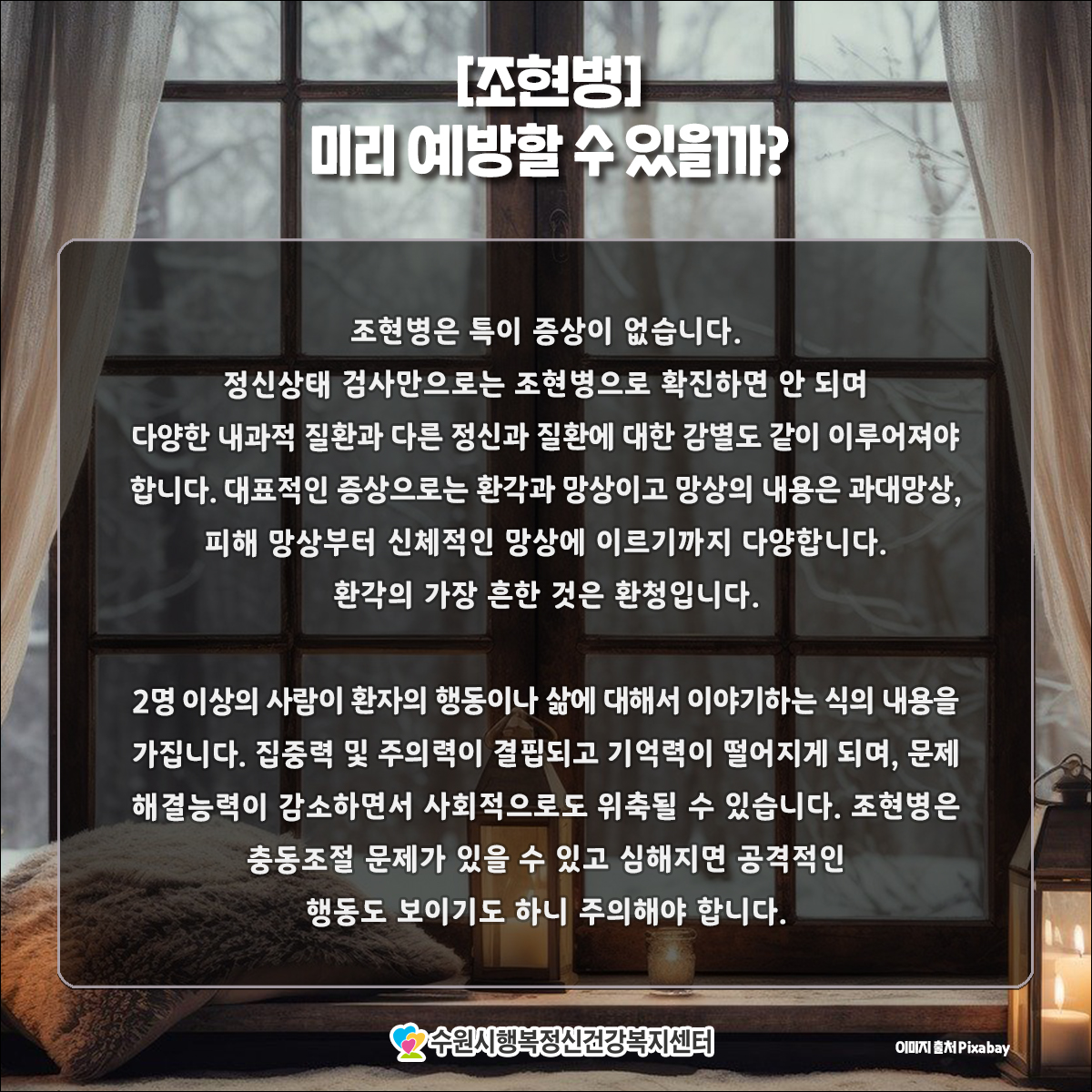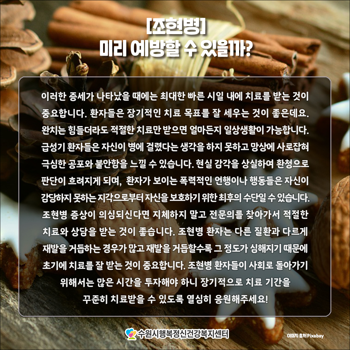 찾아가서 적절한 치료와 상담을 받는 것이 좋습니다. 조현병 환자는 다른 질환과 다르게 재발을 거듭하는 경우가