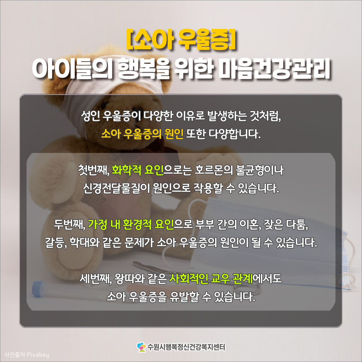 갈등, 학대와 같은 문제가 소아 우울증의 원인이 될 수 있습니다.