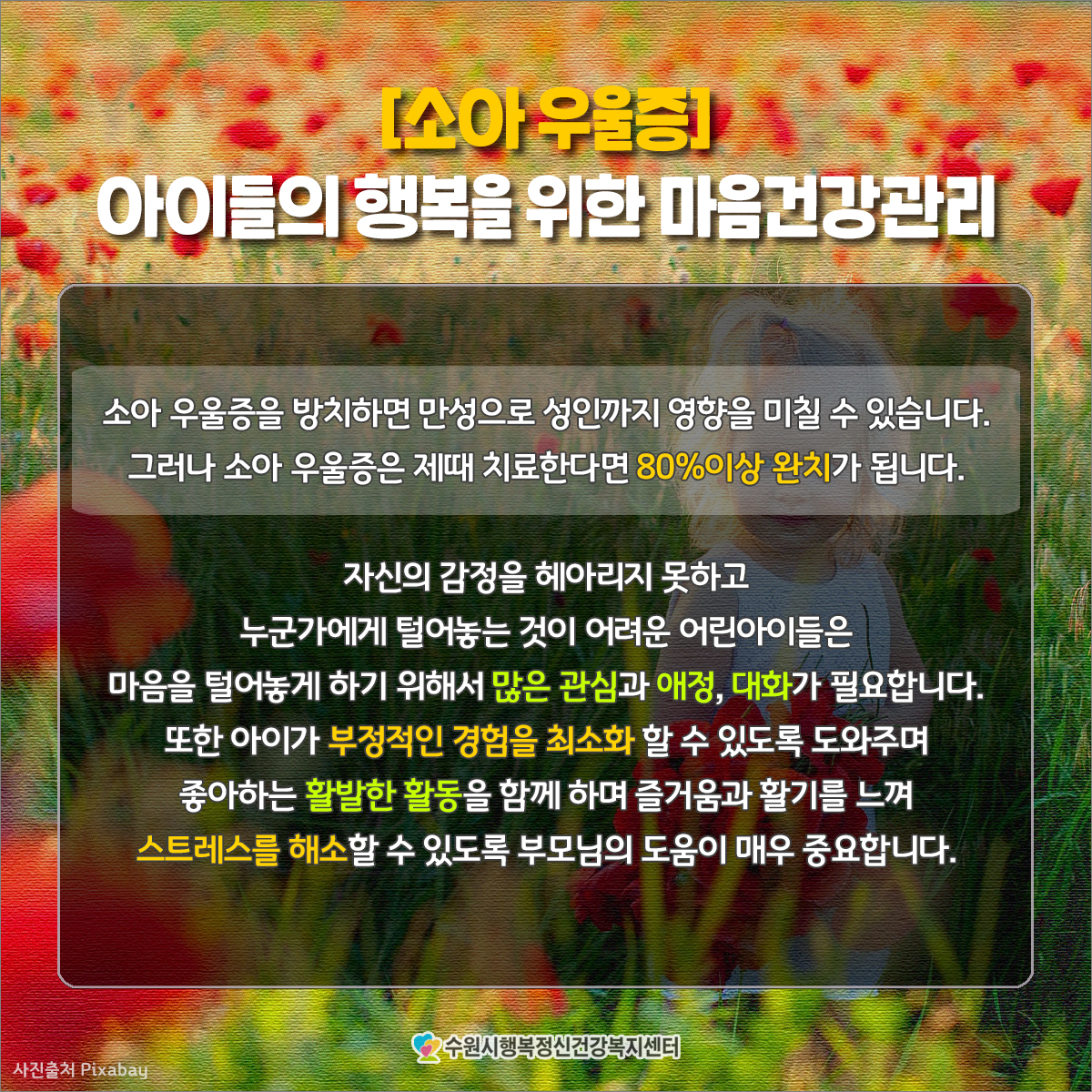 그러나 소아 우울증은 제때 치료한다면 80%이상 완치가 됩니다.