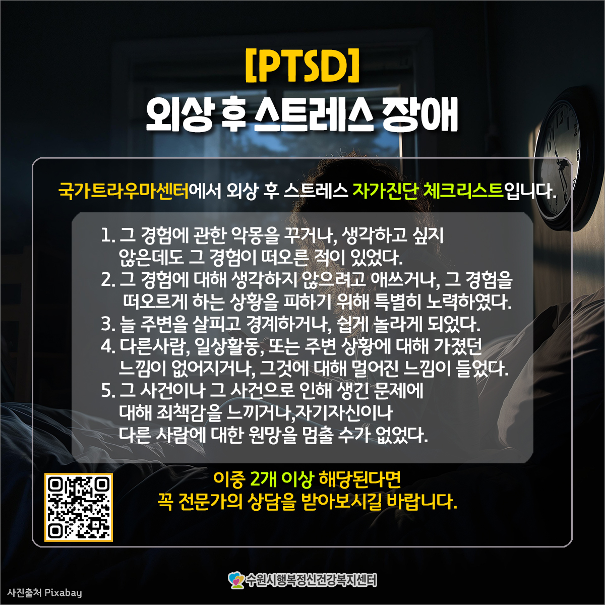 국가트라우마센터에서 외상 후 스트레스 자가진단 체크리스트입니다.
