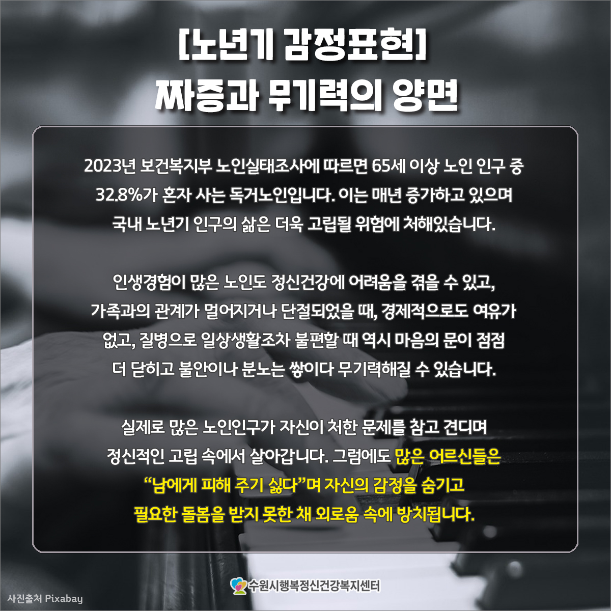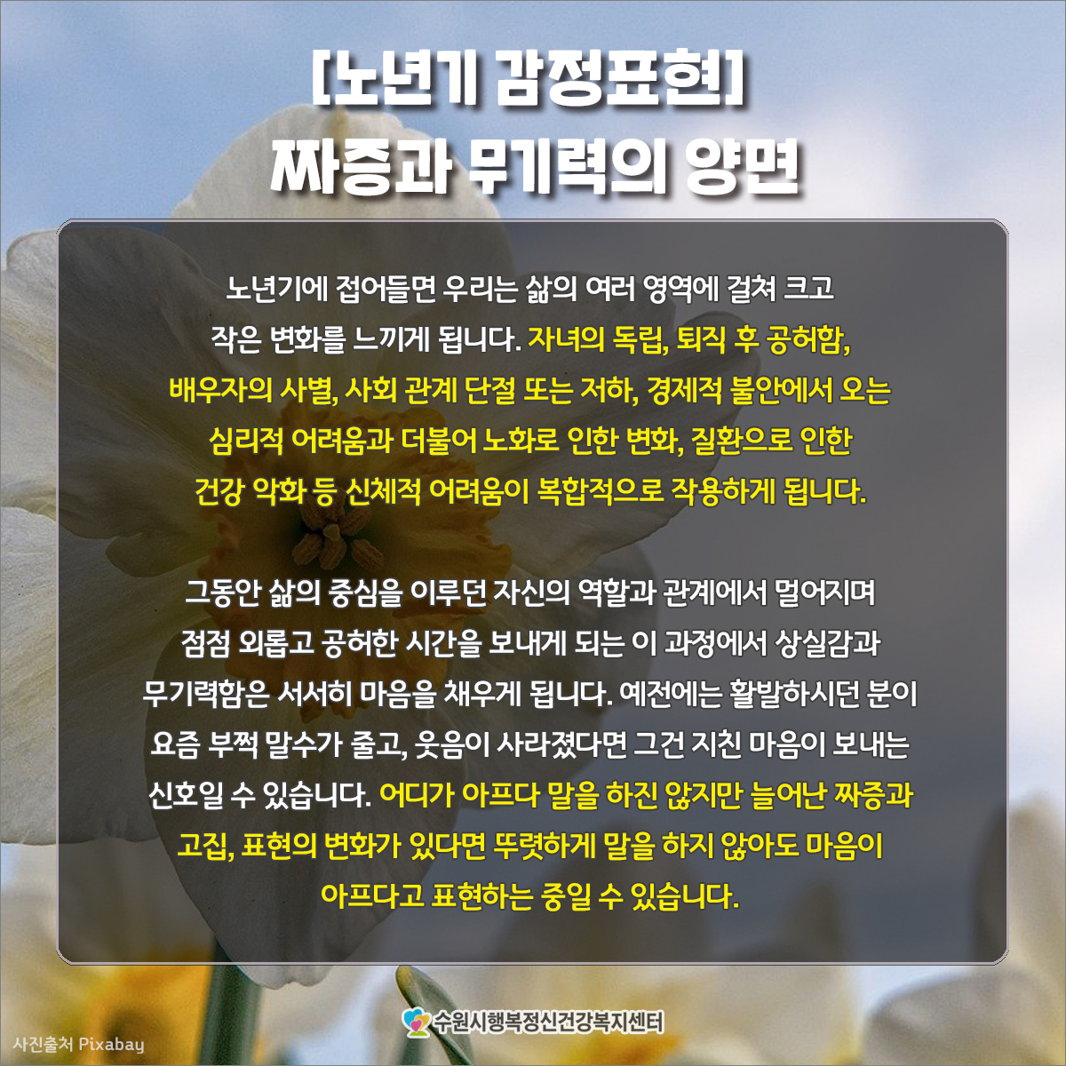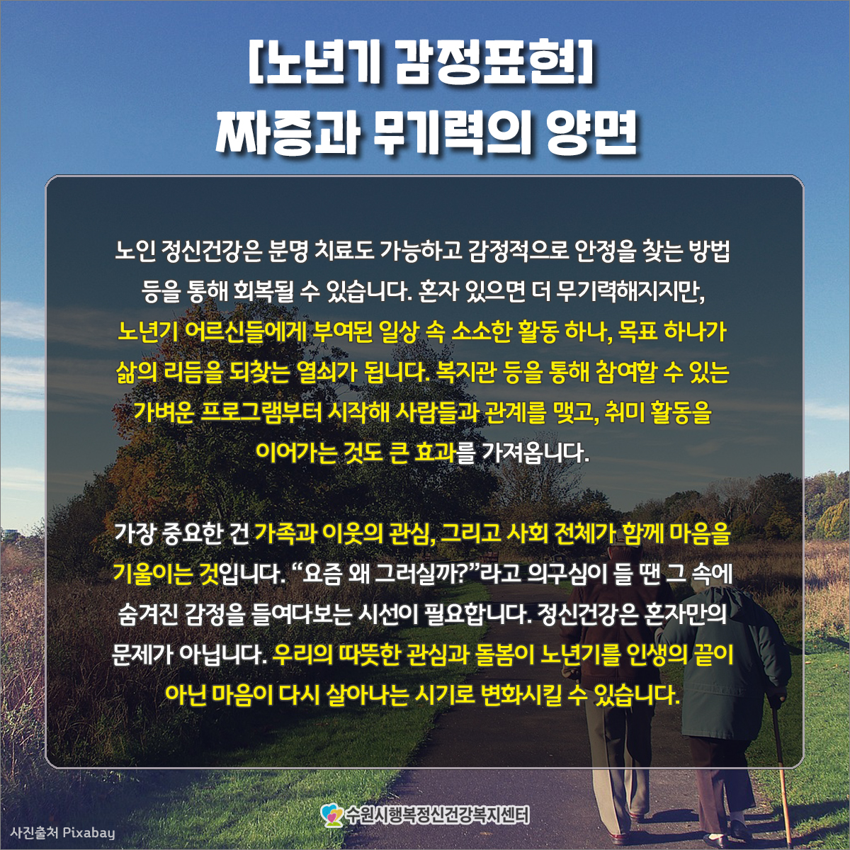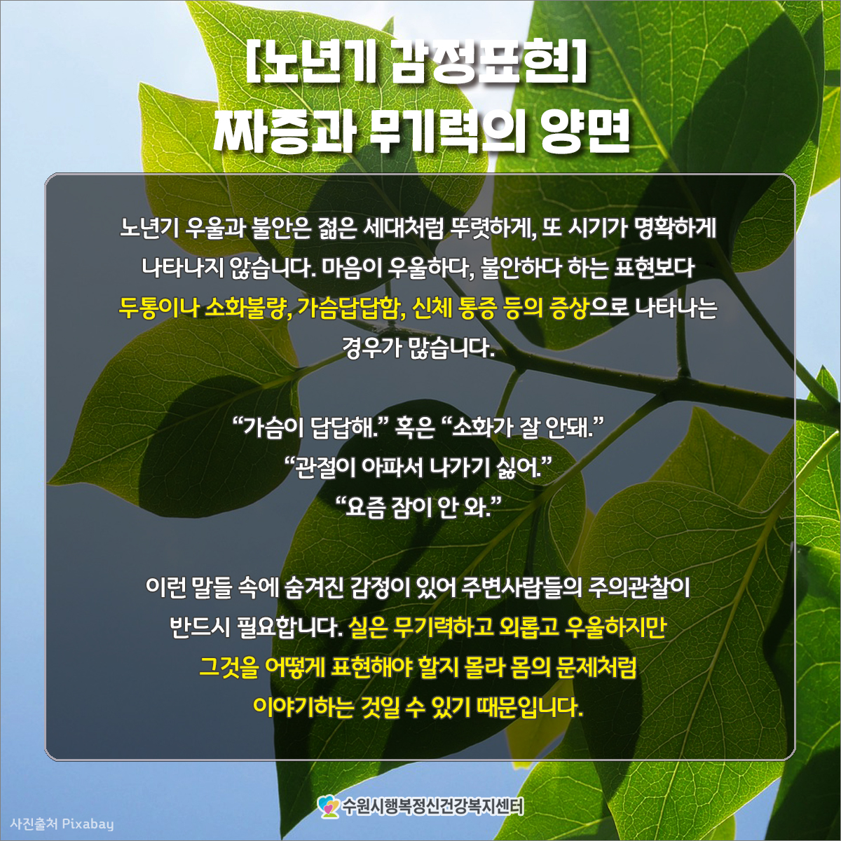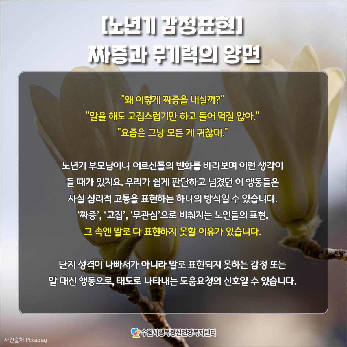 예전에는 활발하시던 분이 요즘 부쩍 말수가 줄고, 웃음이 사라졌다면 그건 지친 마음이 보내는 신호일 수 있습니다. 어디가 아프다 말을 하진 않지만 늘어난 짜증과 고집, 표현의 변화가 있다면 뚜렷하게 말을 하지 않아도 마음이 아프다고 표현하는 중일 수 있습니다.