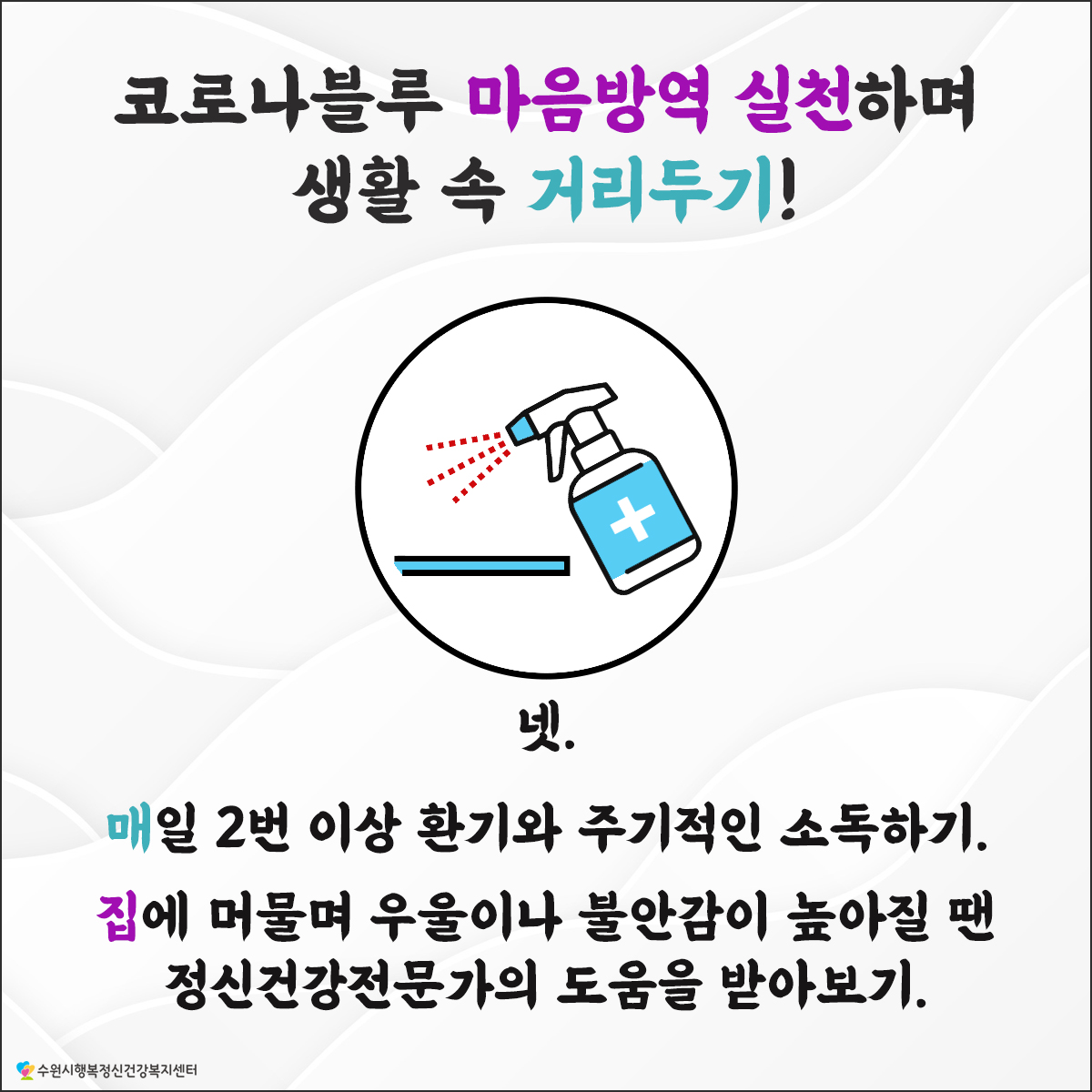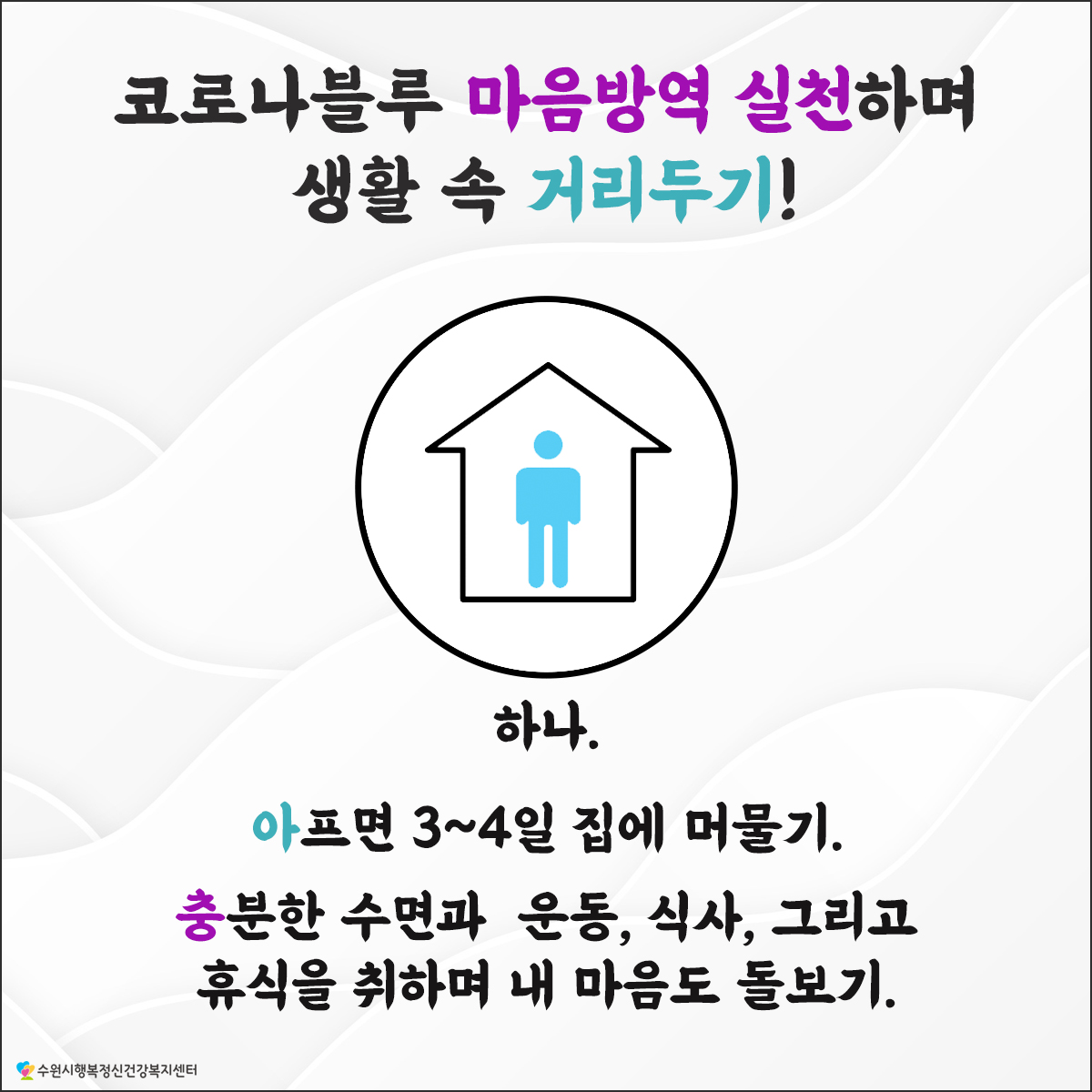 | [코로나블루 극복] 거리두기 실천과 함께 마음에도 방역을 해주세요! | |||