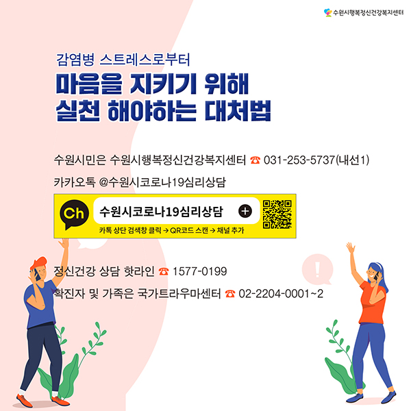 수원시민은 수원시행복정신건강복지센터 031-253-5737, 카카오톡 수원시코로나19심리상담 채널에서 도움을 받으실 수 있습니다.