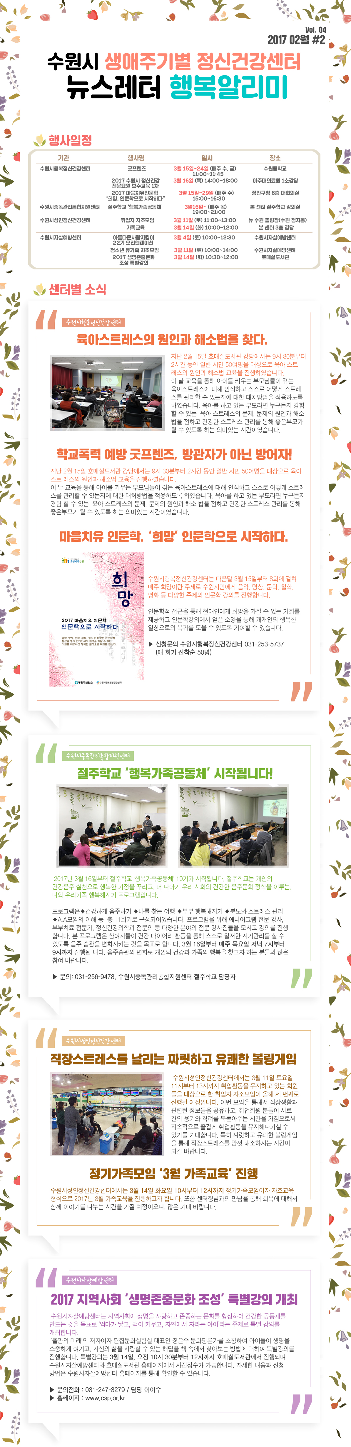 | 수원시 생애주기별 정신건강센터 2017년 2월 Vol.4 행복알리미입니다. | |||