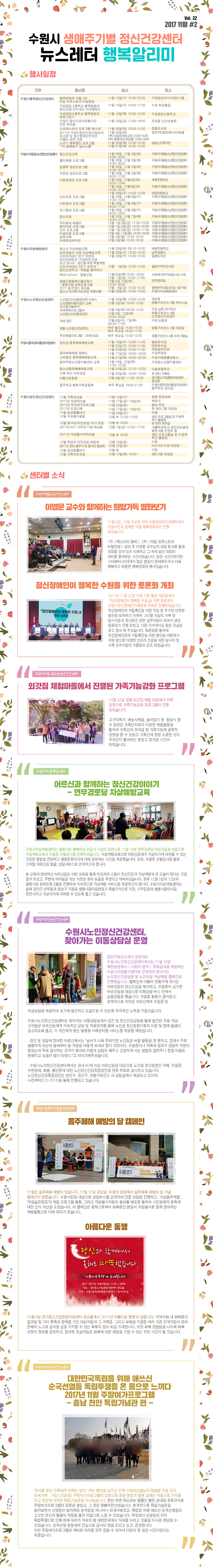 | 수원시 생애주기별 정신건강센터 2017년 11월 Vol.22 행복알리미입니다. | |||