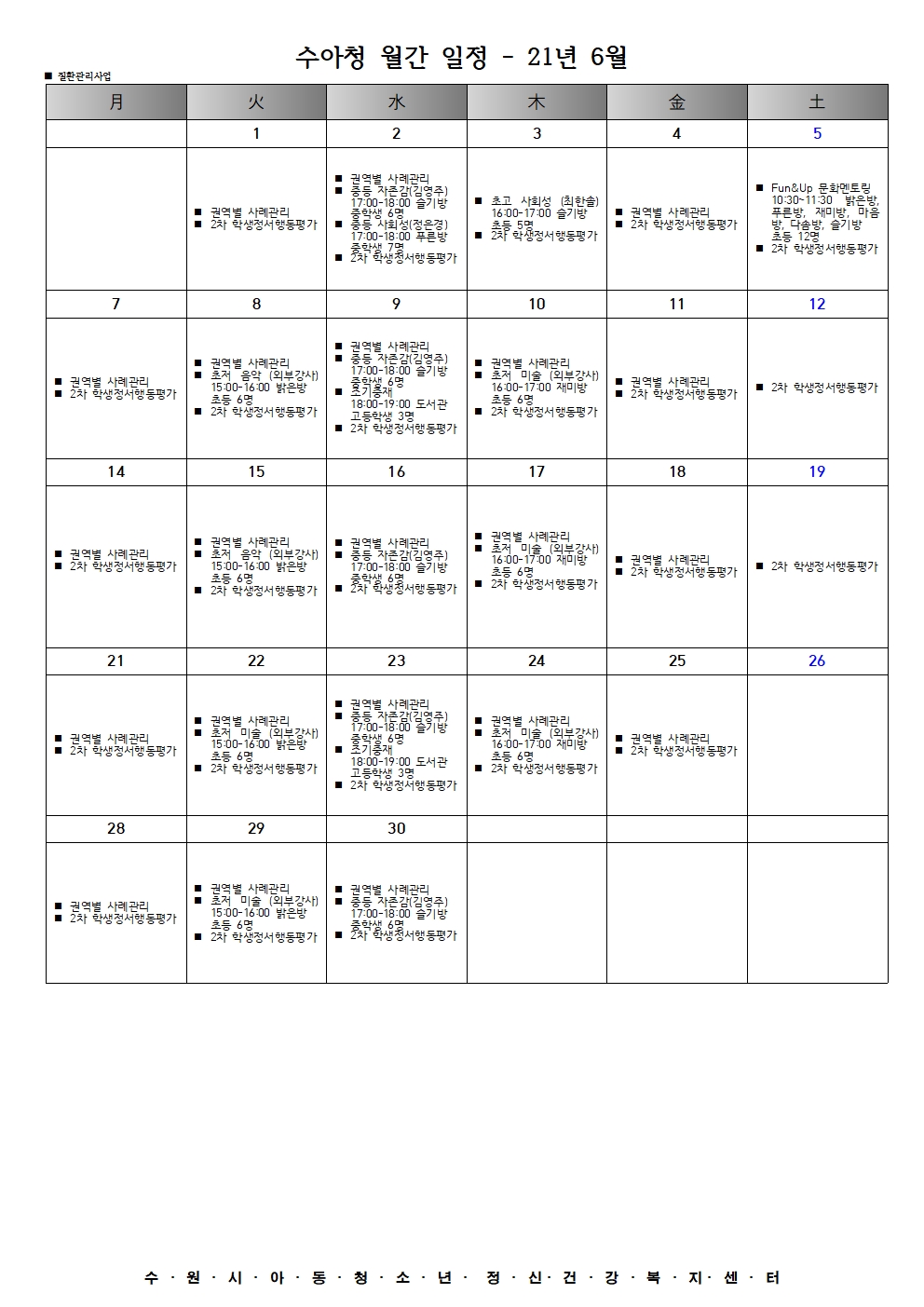 | 수원시아동청소년정신건강복지센터 6월 월간일정입니다. | |||