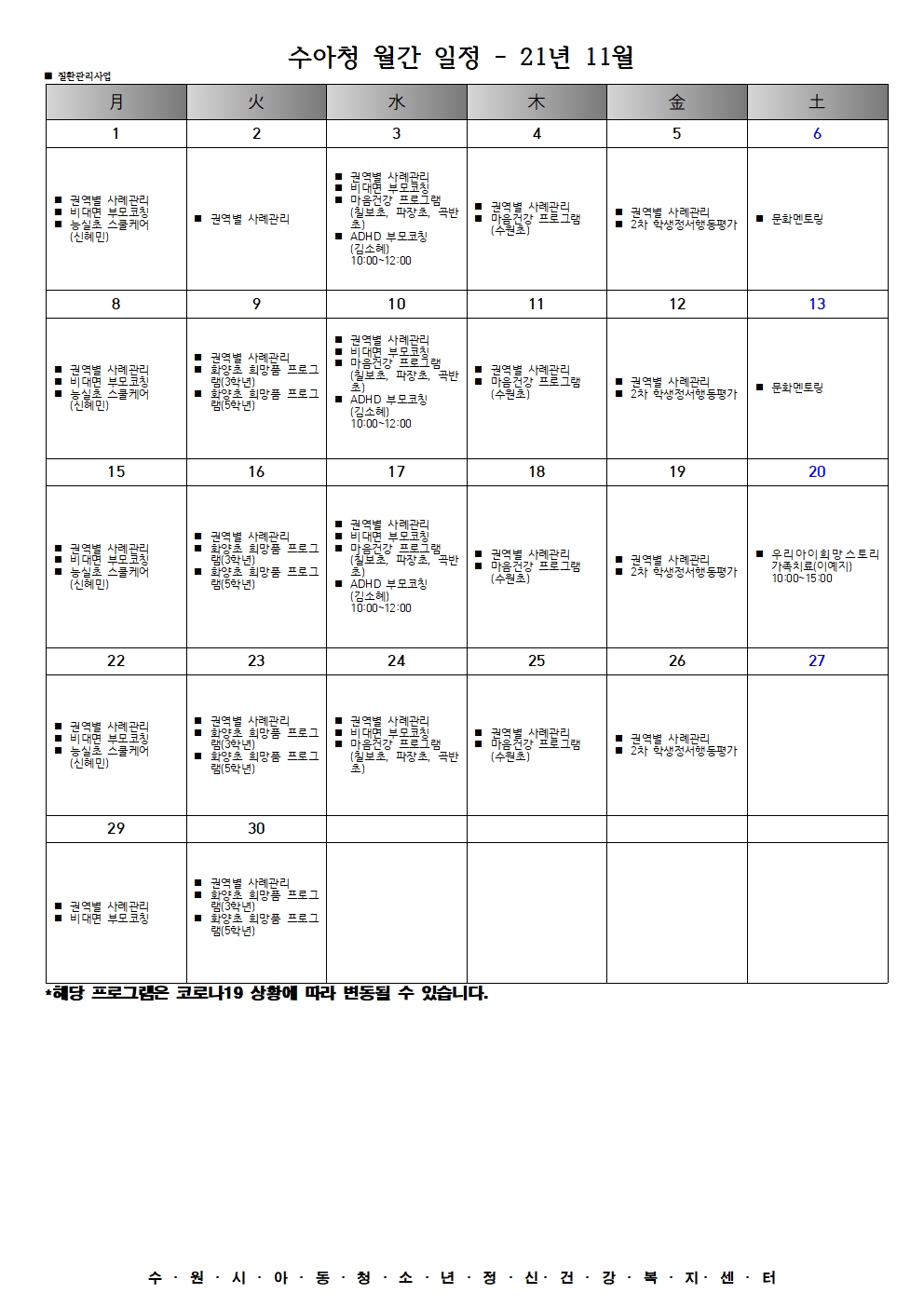 수원시아동청소년정신건강복지센터 11월 월간일정입니다.