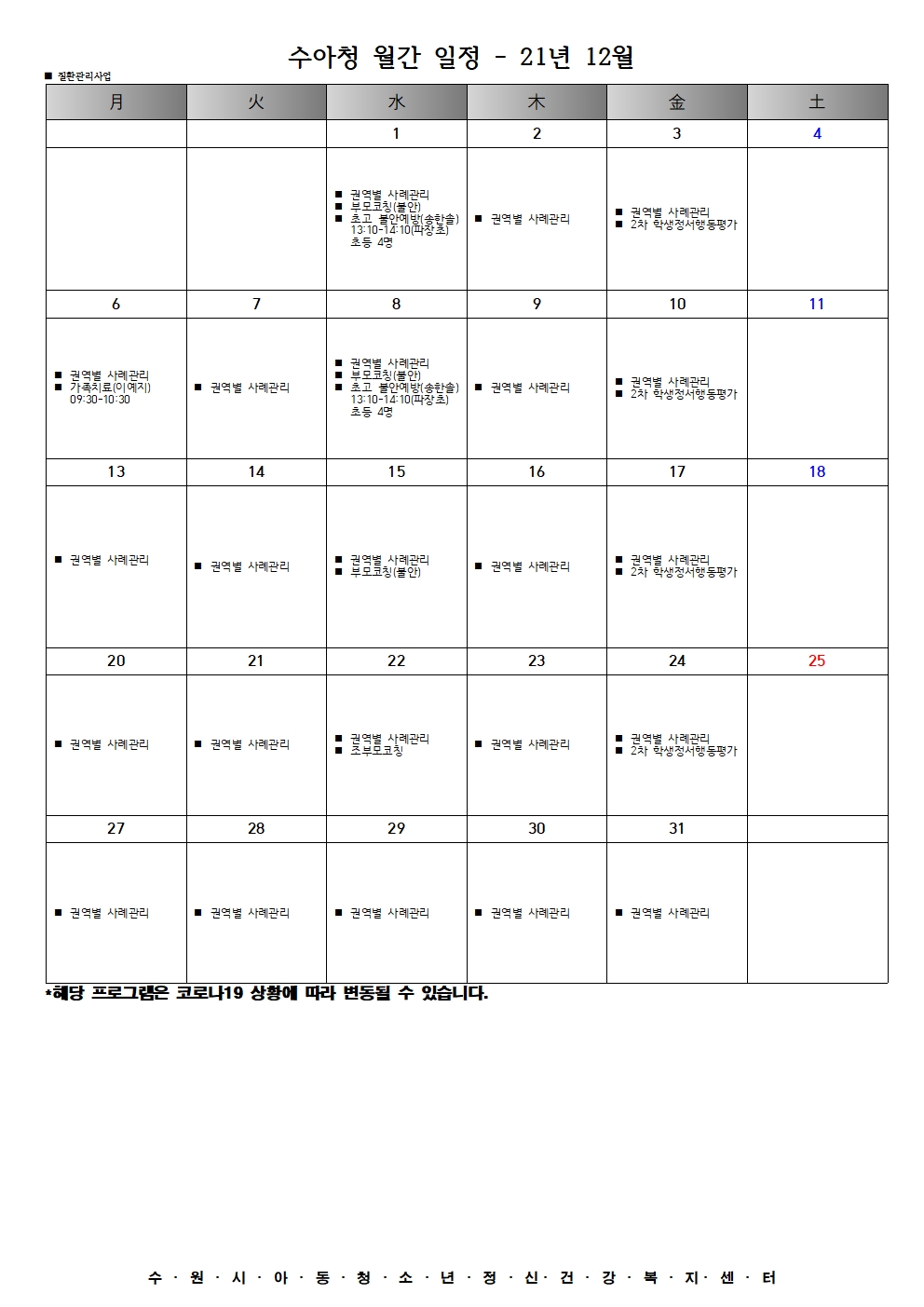 수원시아동청소년정신건강복지센터 12월 월간일정입니다.