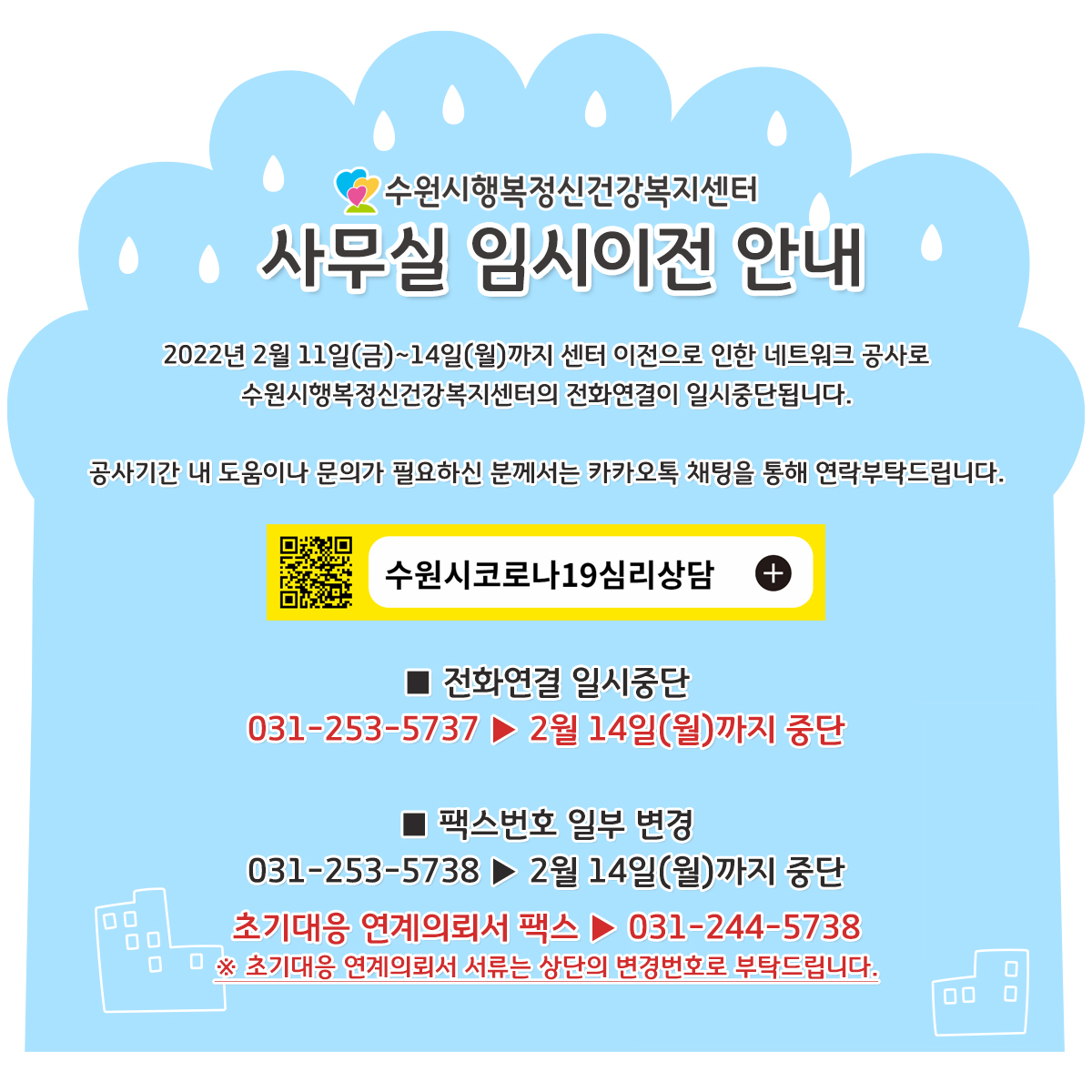 | 수원시행복정신건강복지센터 사무실 임시이전 및 전화연결 안내 | |||
