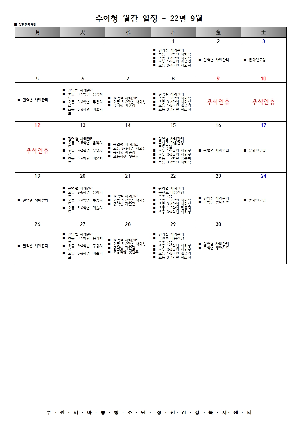 | 수원시아동청소년정신건강복지센터 9월 월간일정입니다. | |||