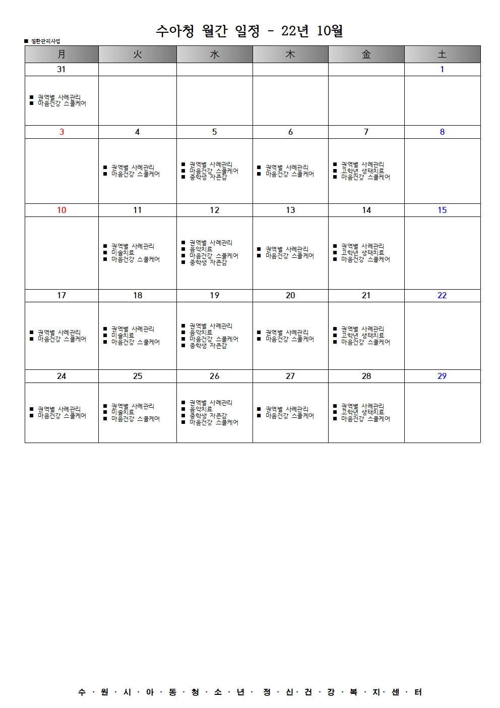 | 수원시아동청소년정신건강복지센터 10월 월간일정입니다 | |||