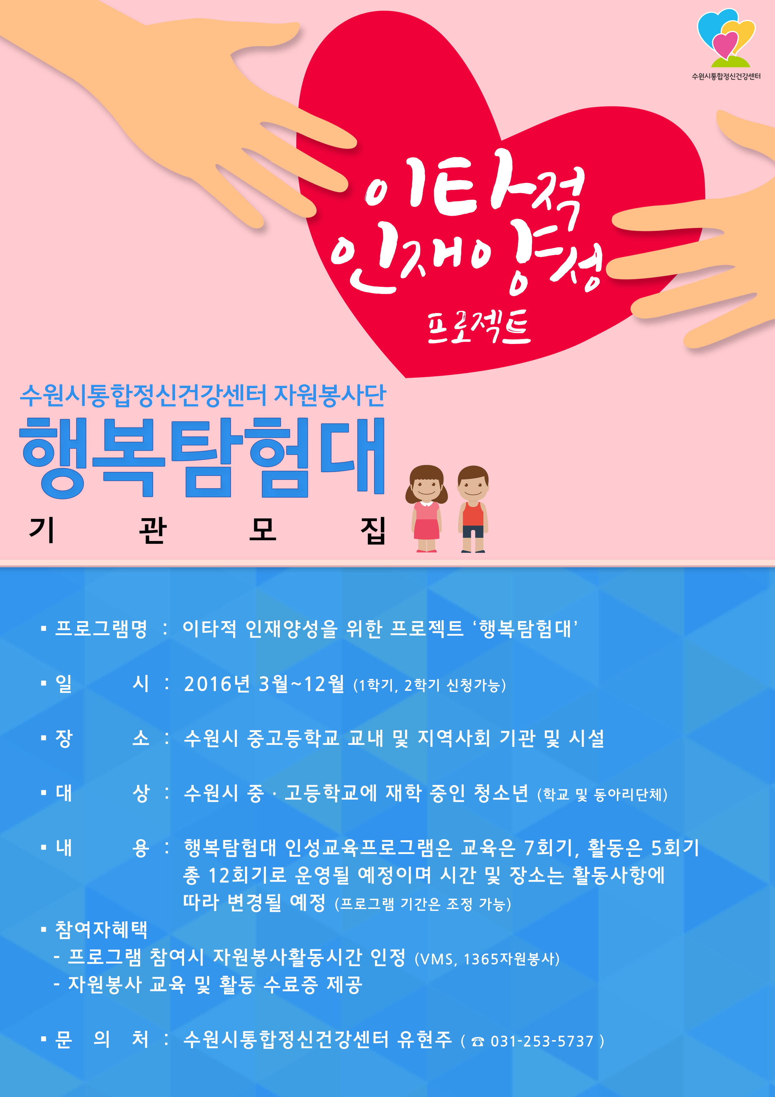 자원봉사프로그램인 <이타적 인재양성을 위한 프로젝트‘행복탐험대’>는 교육부가 주최한 ‘2015년 인성교육 프로그램 인증공모전’에서 전국 정신건강센터 중 유일하게 인증을 받은 프로그램입니다.(120편 접수 중 총7편 인증)