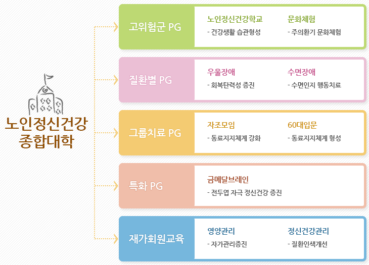 - 노인 정신건강에 대한 통합 교육과 집중 치료 프로그램을 제공하여 노인 정신질환을 관리하고 이중 질환으로 이완되지 않도록 하며, 정신건강을 향상