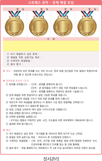 | 정서관리 | 문제해결요법에 따른 해결 | -대상자 스스로 문제점을 파악한다. -해결할 수 있는 방법을 제시할 수 있도록 돕고 실천 여부를 확인한다. |